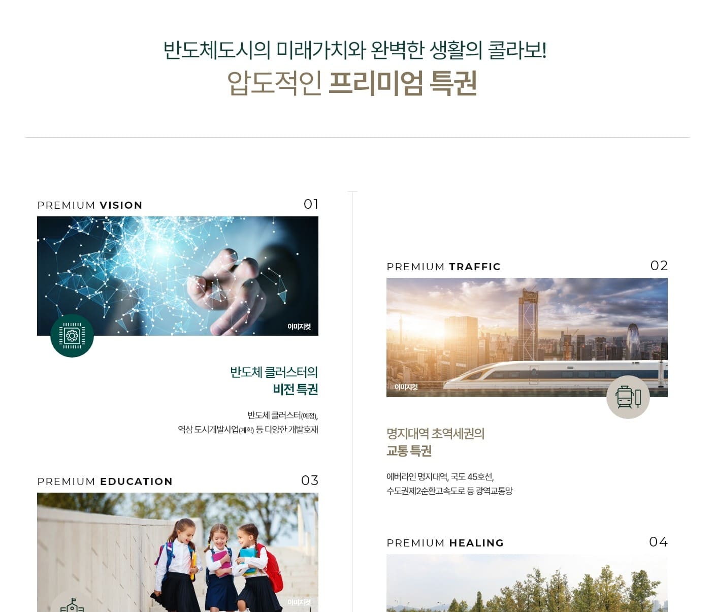 용인시 처인구에 조성되는 반도체 클러스터의 직주근접 수혜가 예상됩니다. 용인푸르지오클루센트는 삼성전자가 조성하는 ‘용인 첨단시스템 반도체 국가산업단지’와 차량으로 10분대, SK하이닉스가 추진중인 ‘용인 반도체 클러스터 일반산업단지’와는 30분대로 이동 가능합니다.